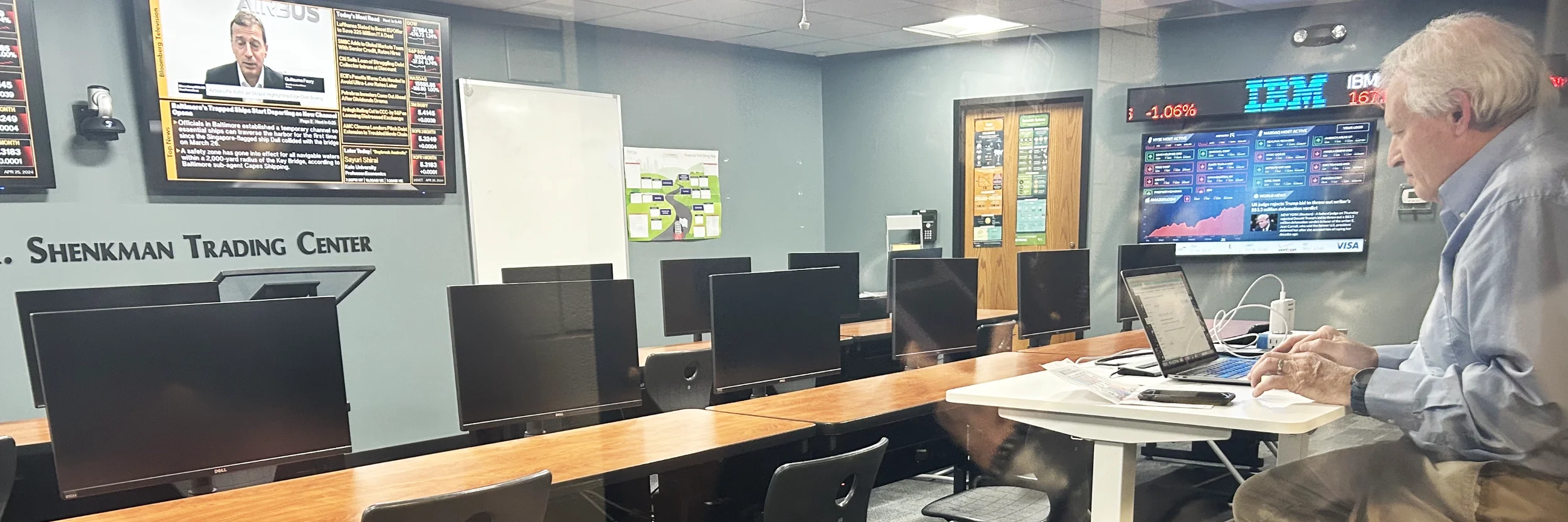 今回の訪問でまず案内されたのは、「Mark R. Shenkman Trading Center」と呼ばれる教室。壁には株価をリアルタイムで表示する電光掲示板が設置され、まるで小さな証券取引所のような空間です。生徒たちはコンピューターを使ってデータを分析し、少額の資金を実際に運用しながら企業の株価を追跡し、市場の動きを投資家の視点で学んでいました。先生のお話からも金融業界での長い実務経験が感じられ、専門的なトピックを生徒が理解しやすいように解説していたのが印象的でした。
